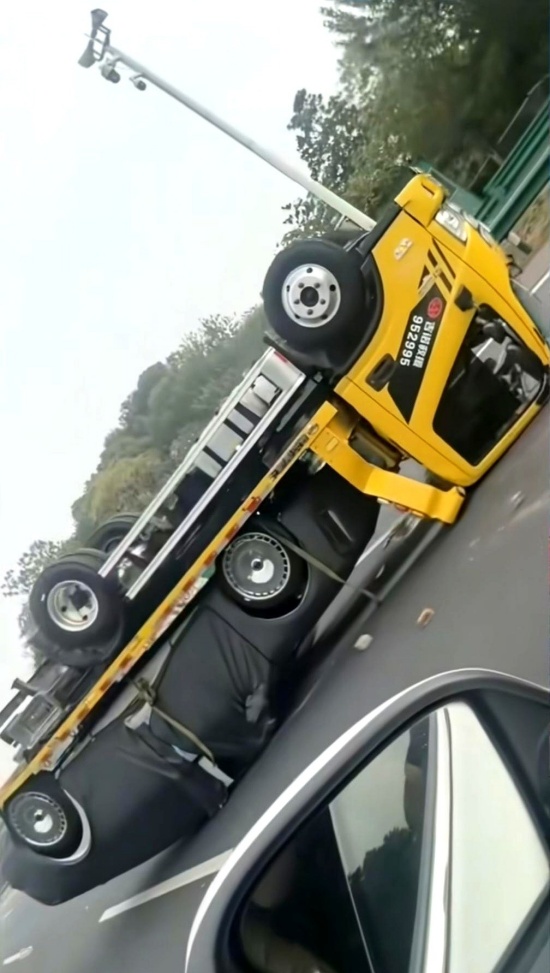 一辆托运尊界S800的拖车遭遇翻车 俩车八轮朝天