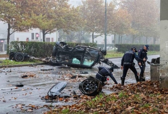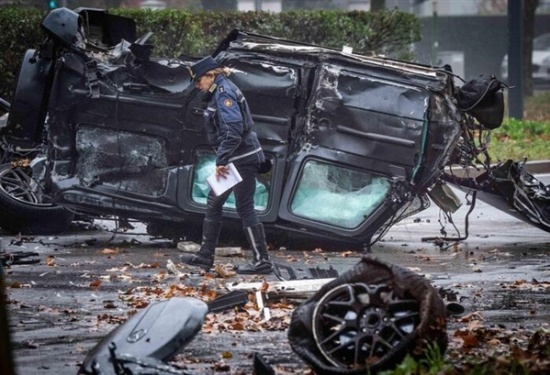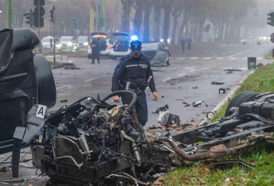 米兰一奔驰大G被撞翻车并断成两截