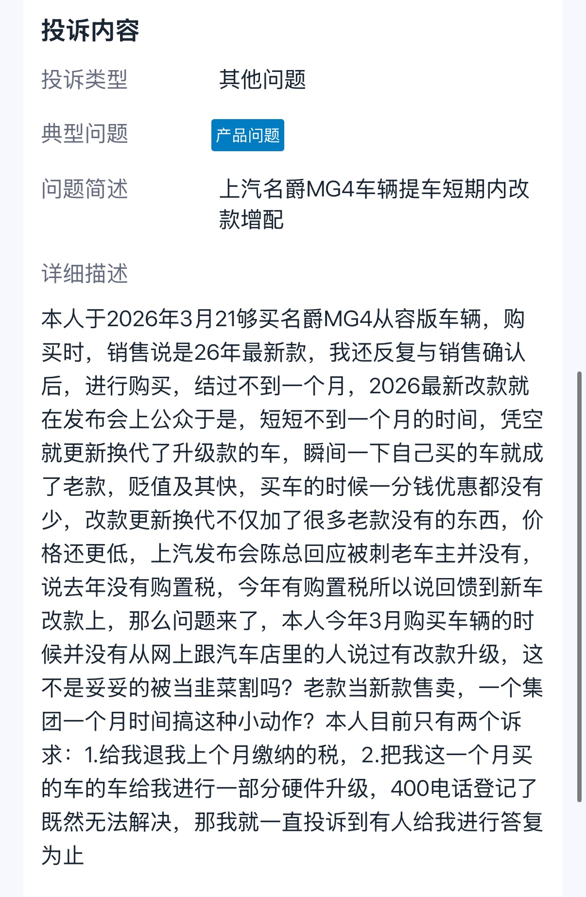MG4论坛上汽名爵MG4车辆提车短期内改款增配