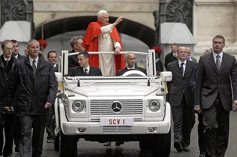 应教皇本人的要求,奔驰公司为其专门生产了一辆敞篷版的白色G500教皇专用车,该车的研发过程历时两年。教皇将用这辆梵蒂冈专用白色敞篷车在圣彼得广场进行惯常的周三赐见活动。