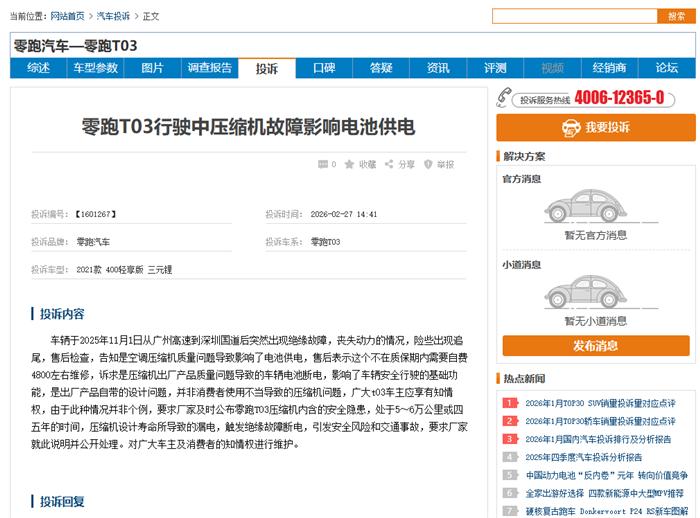 零跑T03行驶中压缩机故障导致动力丧失